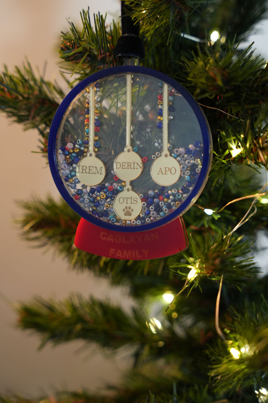 Kişiye özel aile temalı kar küresi süsü — isim detaylı, mavi ve kırmızı tonlarda, içi boncuk dolgulU shaker pleksi tasarım; kadife lacivert kurdele askı detaylı.